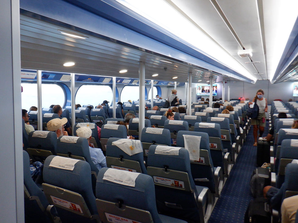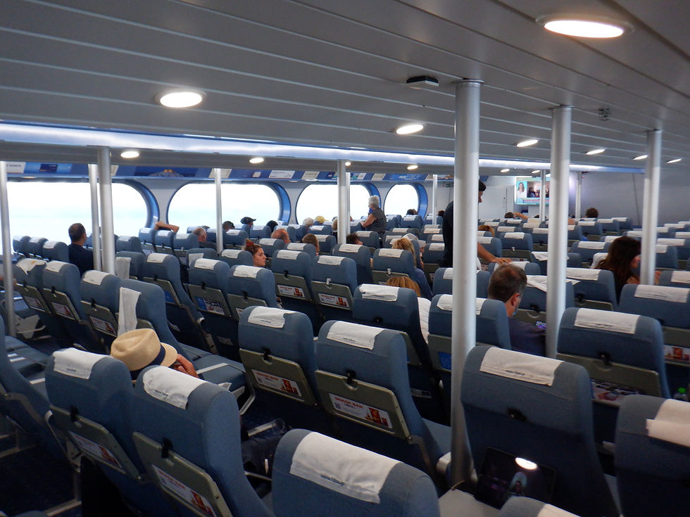 A view of the indoor lounge area on the ship's port side, towards the front section. In the wall located in front of the first row on the left, one can see a map of all the islands that are served by Dodekanisos Seaways. It is noteworthy to state that all of them are served by the DODEKANISOS PRIDE, being the only ship of the company that performs this.