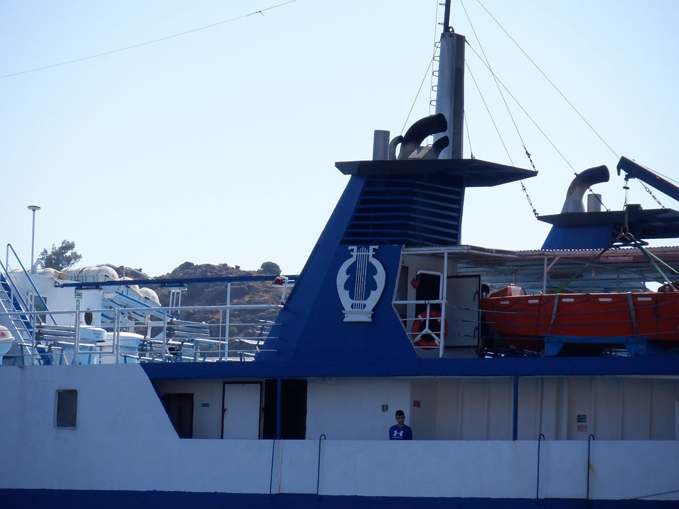 Just as I took a picture of one of the funnels of the DODEKANISOS PRIDE, I decided to do the same with the port side funnel of the NISSOS KALYMNOS. It is painted in the company's dark blue colours, and it features the logo of ANEK Sea Lines. The latter is a lyre, which is also used as a logo by the Municipality of Kalymnos.